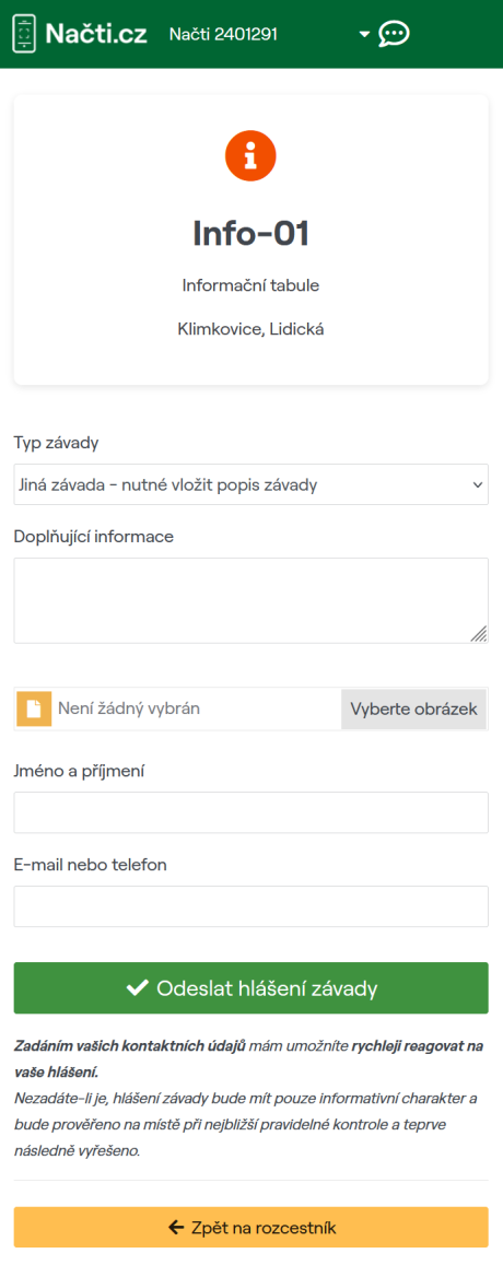 - Zobrazí se stránka pro nahlášení závady tohoto konkrétního POI.