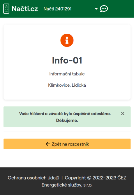 - O úspěšném odeslání hlášení jsme informováni potvrzujícím hlášením.