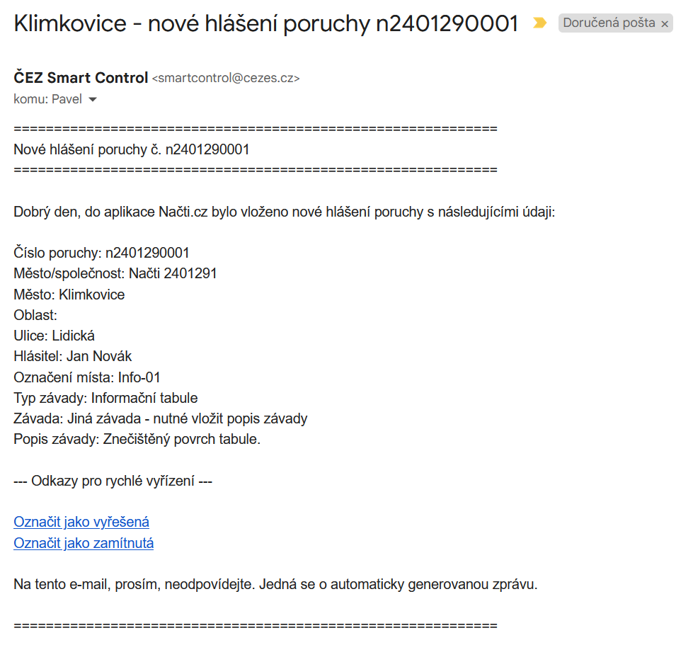 - Pracovníku organizace je odeslán e-mail s rekapitulací hlášené poruchy.
