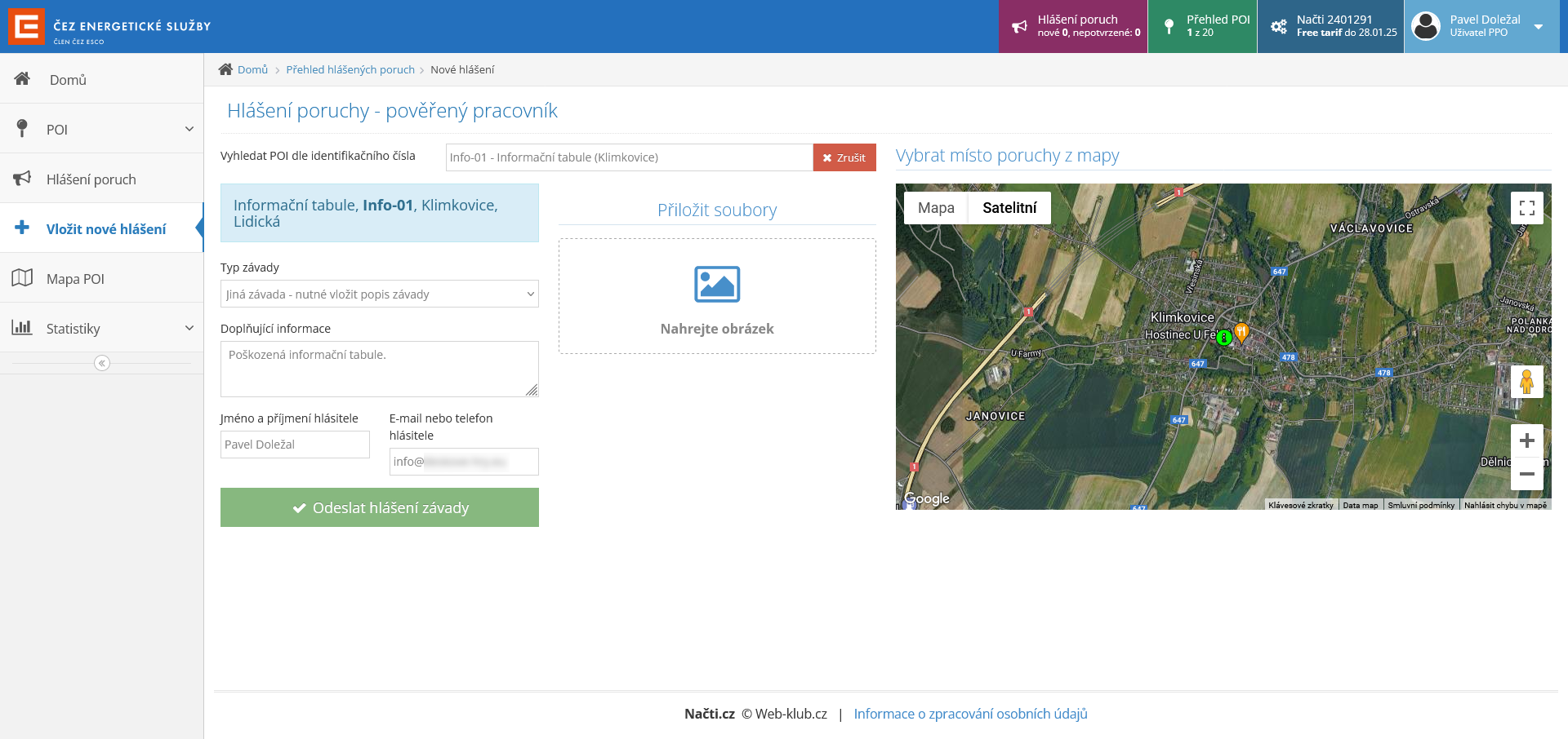 - Po výběru konkrétního POI vyplníme potřebné údaje a hlášení závady odešleme tlačítkem „Odeslat hlášení závady“.
