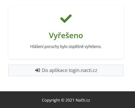 - Hlášenou závadu můžeme označit jako vyřešenou použitím odkazu „Označit jako vyřešená“.