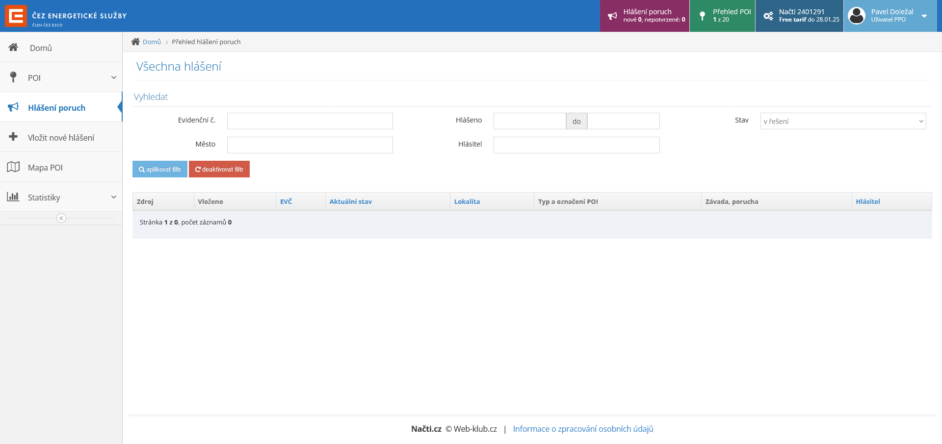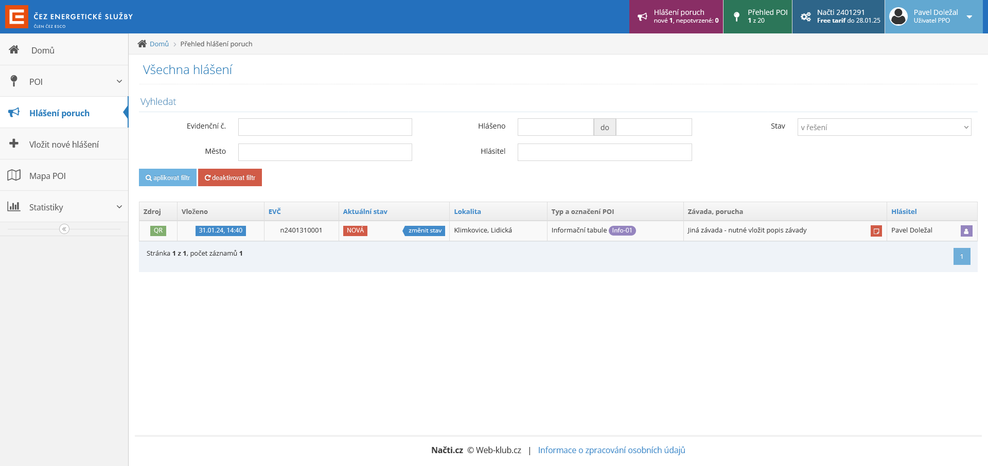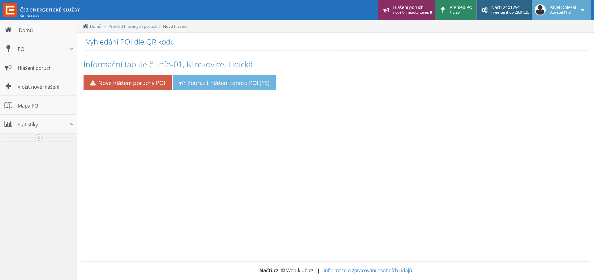 - „Nové hlášení poruchy POI“ – kliknutí na tlačítko vede k procesu hlášení poruchy.