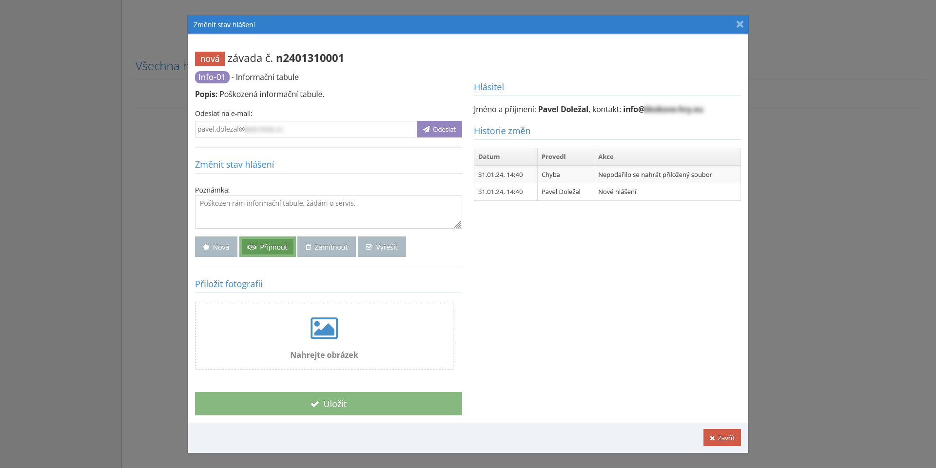 - Můžeme doplnit poznámku nebo fotografii a hlášení „Uložit“.