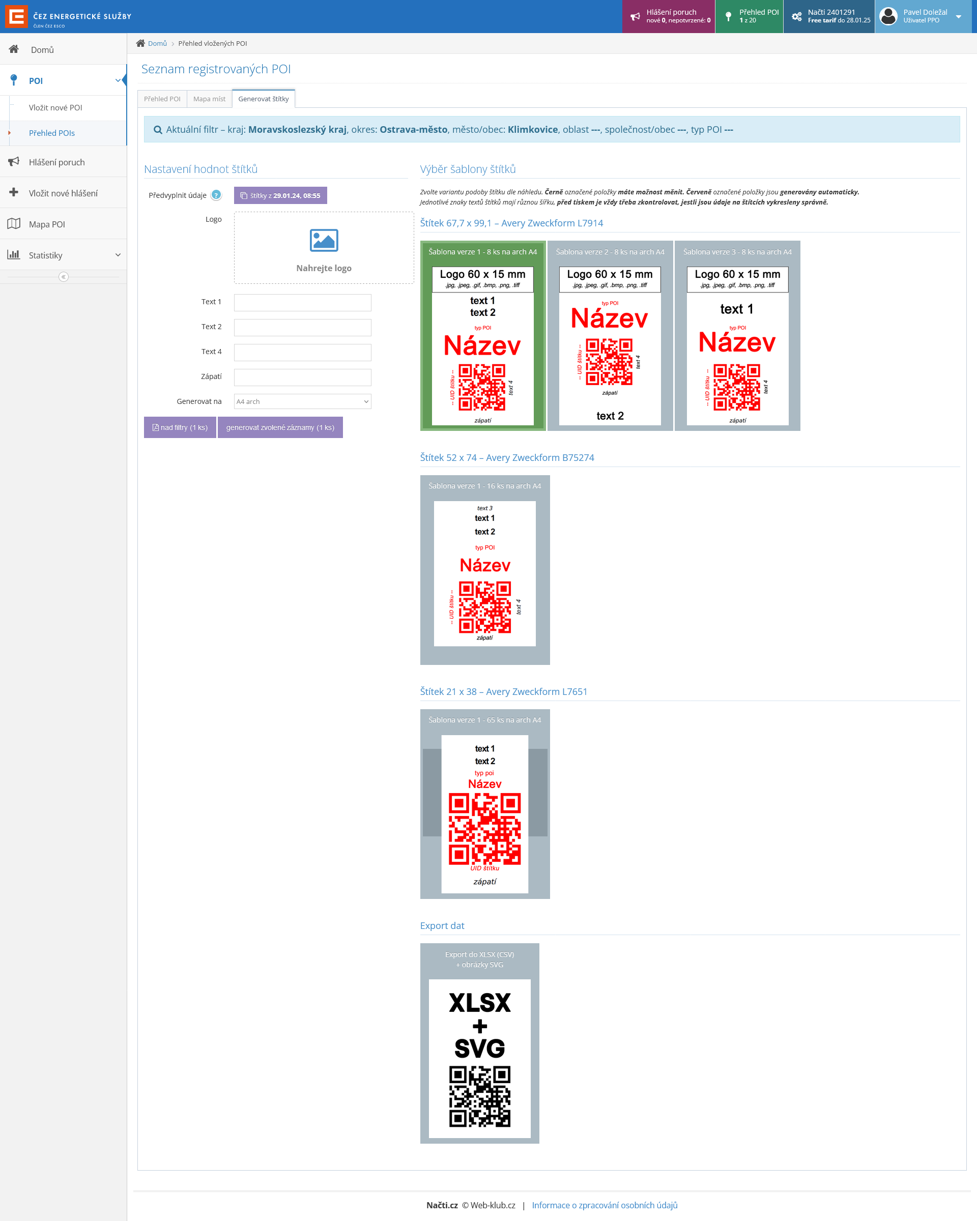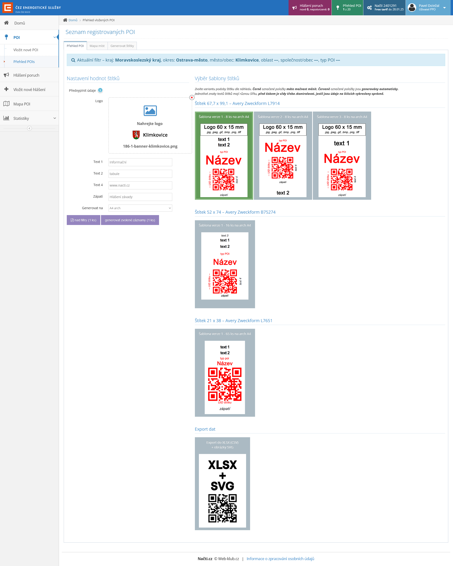 Výběr nebo filtrace POI, které budeme označovat QR štítky. Výběr a vyplnění tiskové šablony štítků.
